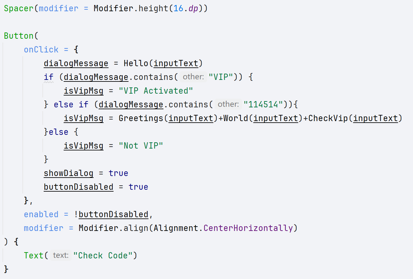 是不是跟原本代码里的onClick一模一样。为什么回调函数会生成一个类呢?答案是为了捕获外层变量(闭包嘛)(从构造函数传引用进去)。再来看看逻辑部分,要进入VIP Activated分支,必须要使Hello函数的返回值里包含VIP。而114514那个分支则是出题人乱写的,只要我们打开so看一看Greetings, World, CheckVip这几个函数就能马上意识到(除非你认为出题人的代码在程序运行后会patch自己,但稍加验证就知道并不会)。